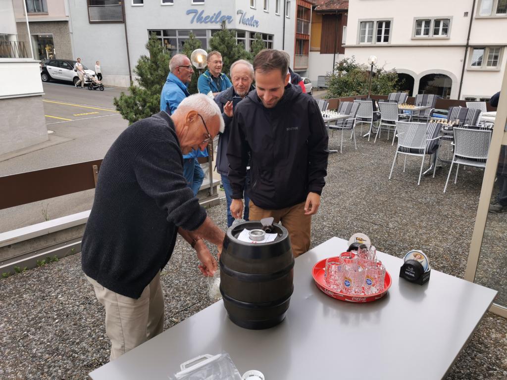 aus metrologischer Sicht konnte das Timing nicht besser sein. Bei sommerlich angenehmen Temperaturen konnte das Fass Bier von Ehrenpräsident und Präsident angestochen werden. -- Es klappte auf Anhieb. Rund 12 Vereinsmitglieder plus zwei Gäste, Ruth Koch und Bruno Forster, erfreuten sich an den Schachspielen, den feinen Grillwürsten und dem Bier.